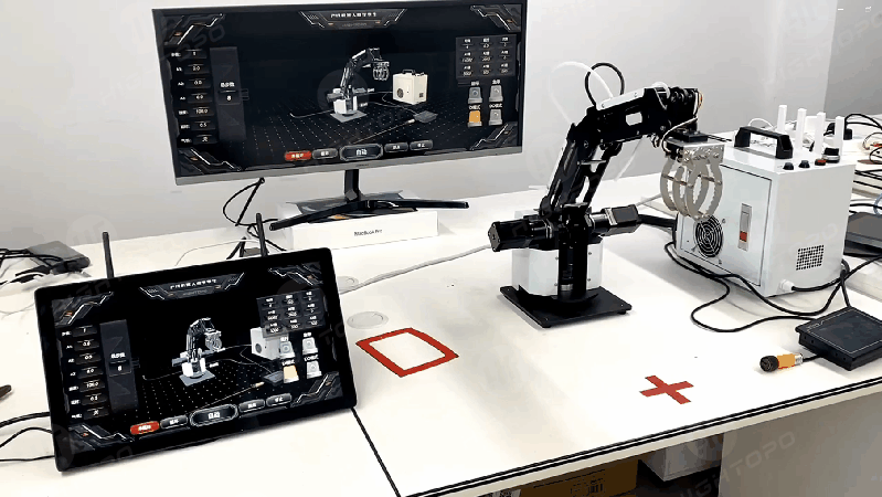 数字孪生产线机械臂集成了工业控制、数据采集、物联网、低代码开发和虚拟仿真等技术的先进应用。图扑依托自研 HT 低代码数字孪生平台,构建生产线机械臂的高精度虚拟模型,既能实时映射物理机器人在生产线上的操作状态,又能控制机械臂运动状态,为虚实联动提供了强大而灵活的支持。