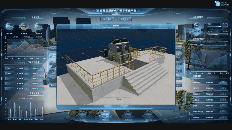 数字孪生污水处理厂监控平台内可针对格栅机、水泵等关键设备开展 360° 可视化结构巡检。结合振动、温度、压力等传感器回传的监测数据,直观反映轴承磨损、密封件老化等内部隐患。