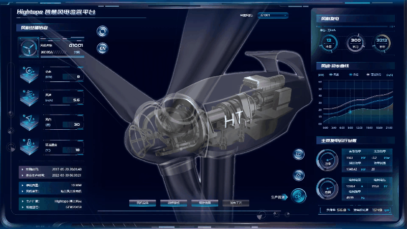 针对海上、山区极端环境挑战,HT 系统通过高精度三维模型精准复现叶片、轮毂、齿轮箱、发电机等关键部件,动态演示风向变化时偏航系统自动调整叶片角度的运行过程。