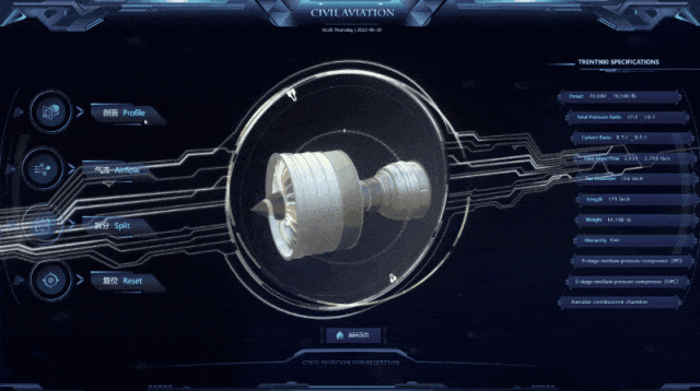 在航空发动机维护与研发领域,通过图扑 HT 还原拆解复位系统,帮助技术人员按标准检修流程,对压气机叶片、涡轮组件等核心部件进行分步拆解与装配模拟。系统支持任意角度的发动机剖面展示,能清晰呈现发动机任意角度的剖面结构,使原本隐藏在内部的油路、气路以及精密的机械部件立体化呈现。为研究人员、工程师以及教学人员提供了深入剖析发动机内部构造的绝佳视角。