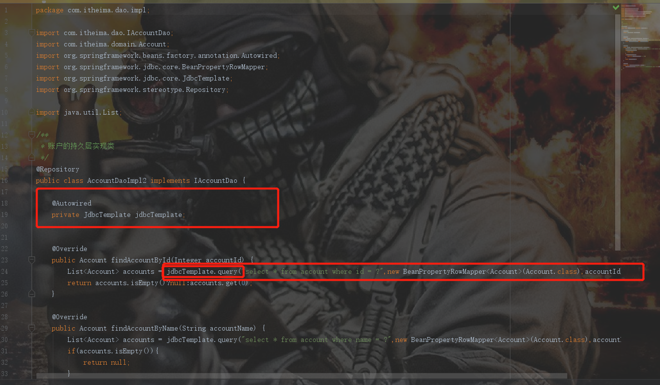 // //查询所有 BeanPropertyRowMapper和AccountRowMapper是由区别的,BeanPropertyRowMapper不用在定义Account的封装