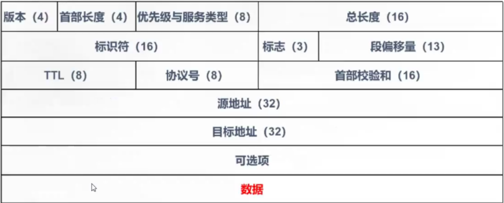 目标地址(32) :目标ip地址,表示接收端的IP地址