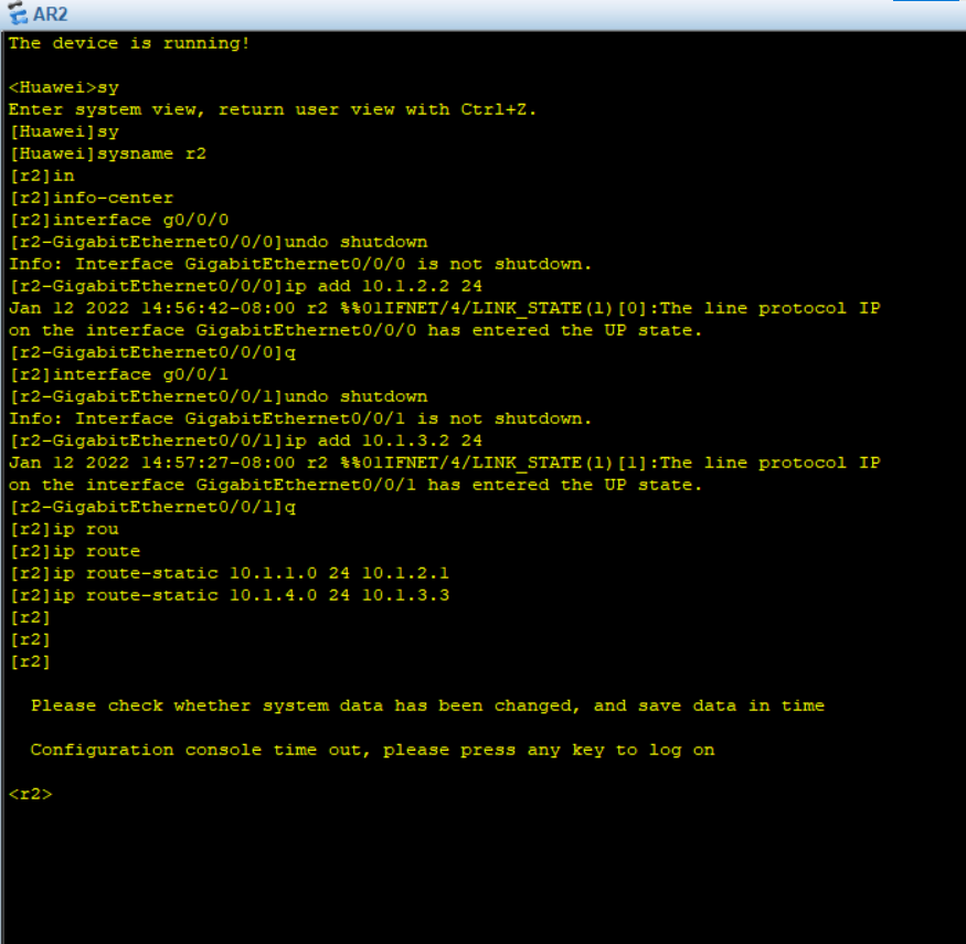 配置静态路由相关命令:ip route-static 10.1.3.0 24 10.1.2.1