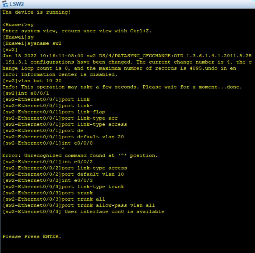 注意接口类型,access接口只允许一个vlan通过,trunk接口允许多个vlan通过,因此交换机与主机之间的接口类型为access,交换机与交换机之间的接口类型为trunk