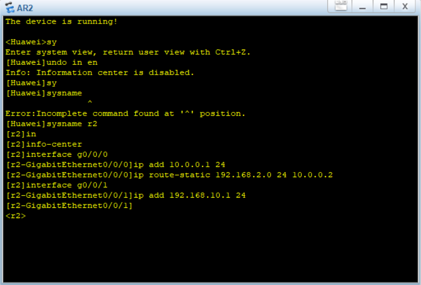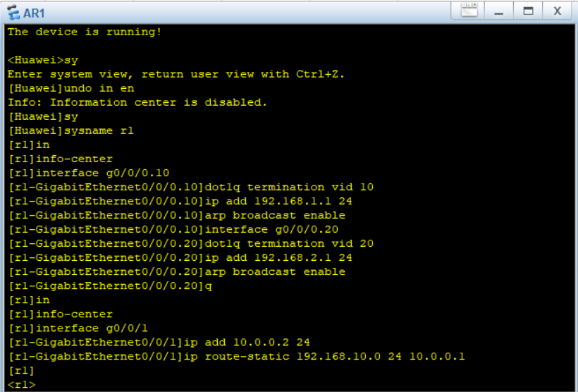此外,还需要配置静态路由IP route-static 192.168.10.0(非直连网段) 24(子网掩码) 10.0.0.1(下一跳地址)