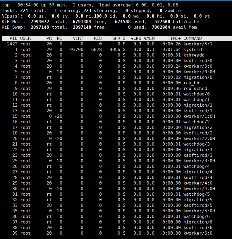 第四行:内存 total(总内存),free(空闲内存),used(已用内存),buff/cache(物理和交换内存的缓冲区内存)
