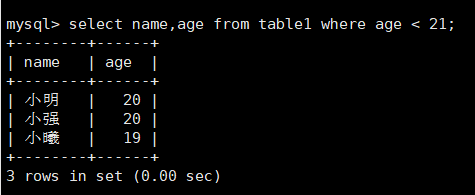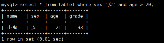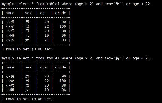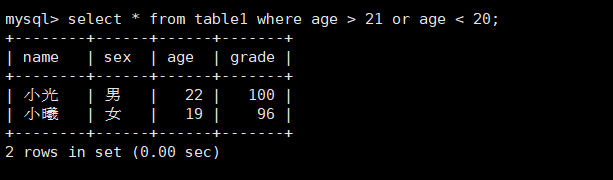 select * from table1where (age > 21 and sex='男') or age < 20;