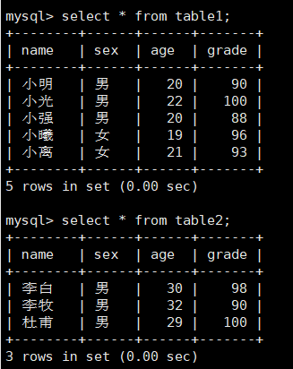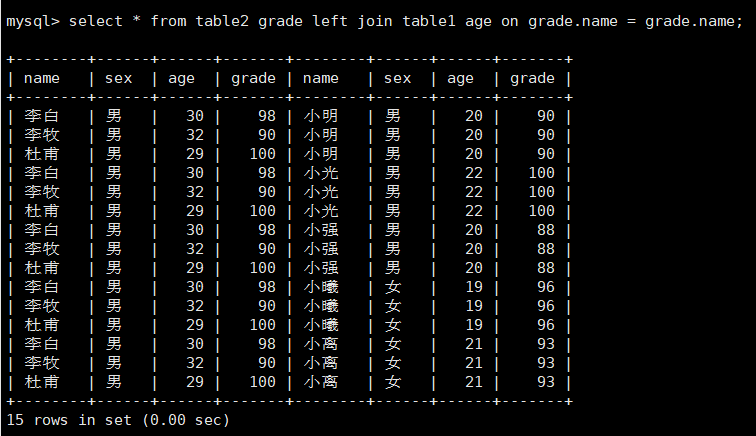 select * from table2 grade left join table1 age on grade.name = grade.name;