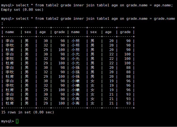 select * from table2 grade inner join table1 age on grade.name = grade.name;