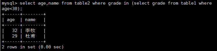 select age,name from table2 where grade in (select grade from table1 where age<30);