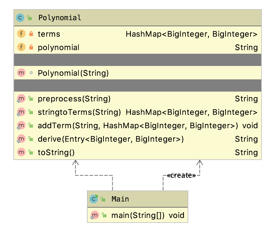 - 作业1只设计了两个类:Main和Polynomial. Polynomial中通过一个HashMap<BigInteger, BigInteger>的属性来保存表达式,表达式的每一项的指数作为键,系数作为值。