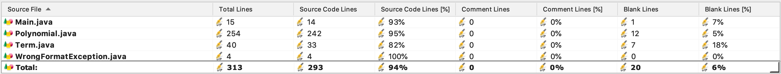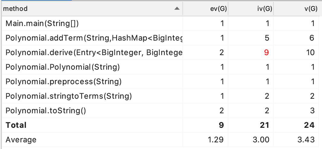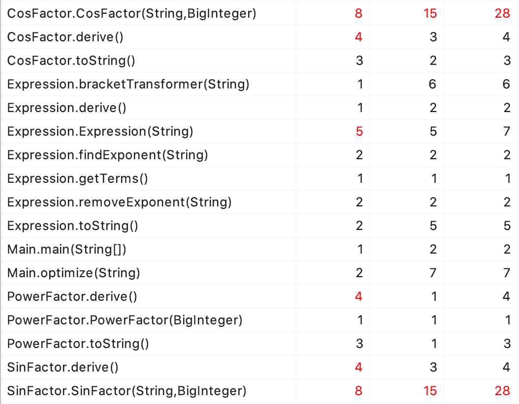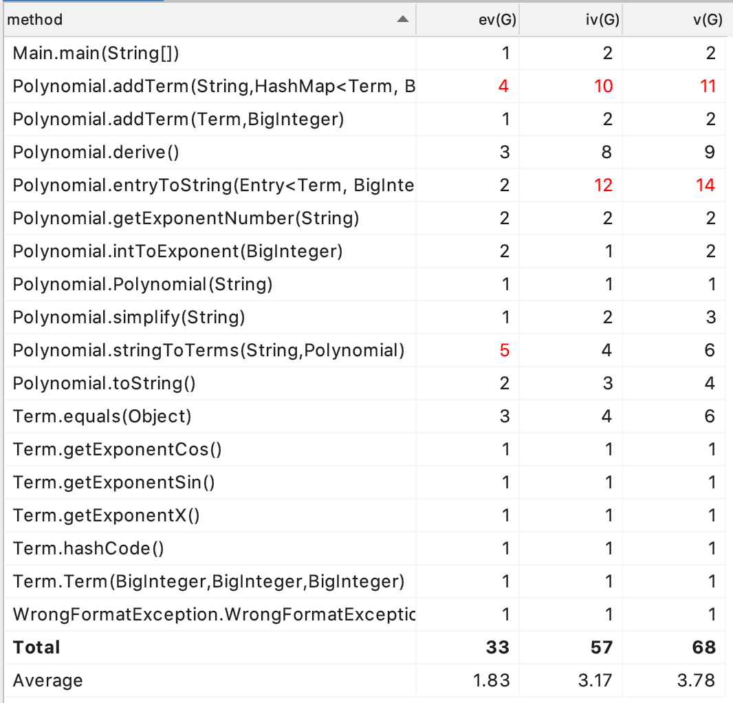 - 复杂度方面,比较复杂的方法有三个:stringToTerms(把输入的字符串分解成项字符串), 涉及到Wrong Format的判断条件;addTerm(把项字符串解析成Entry), 涉及到几种因子的分支和循环;entryToString(把求导后的项转换为字符串),涉及到特殊情况的判断;我认为这几个方法相对复杂是比较正常的情况。