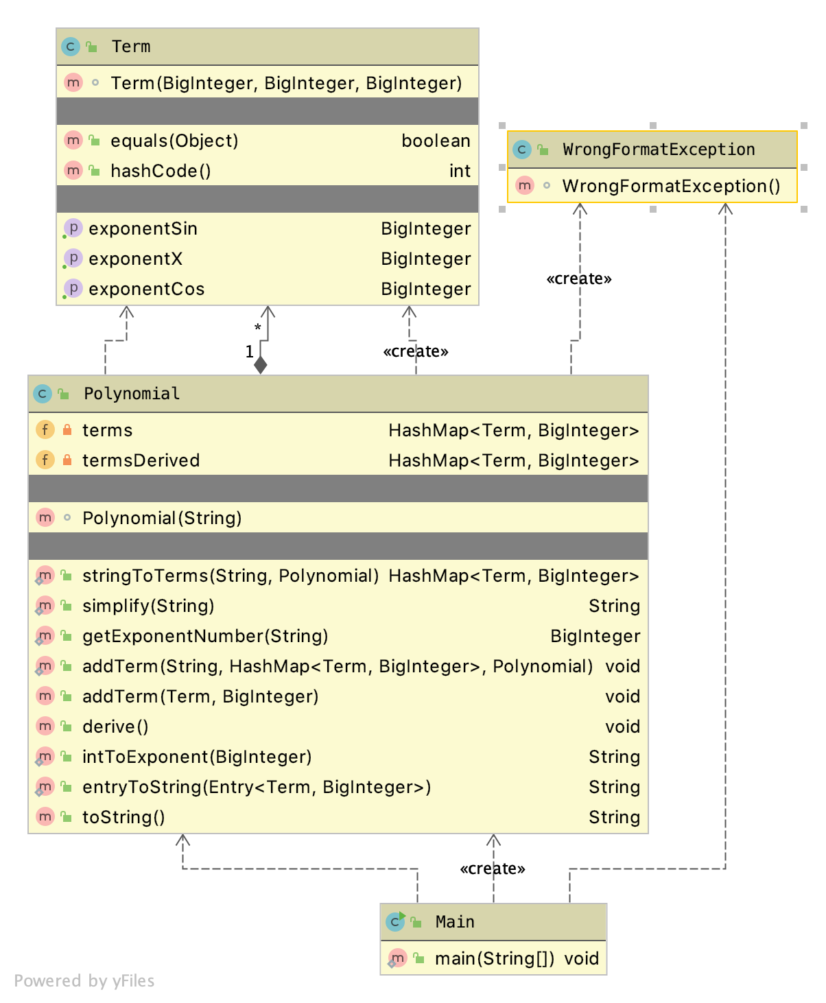 - 作业2基本上延续了作业1的设计,增加了WrongFormatException和Term类。Term中包含三个属性,分别表示一项中幂函数因子、正弦因子和余弦因子的指数。Polynomial中通过一个HashMap<Term, BigInteger>的属性来保存表达式。