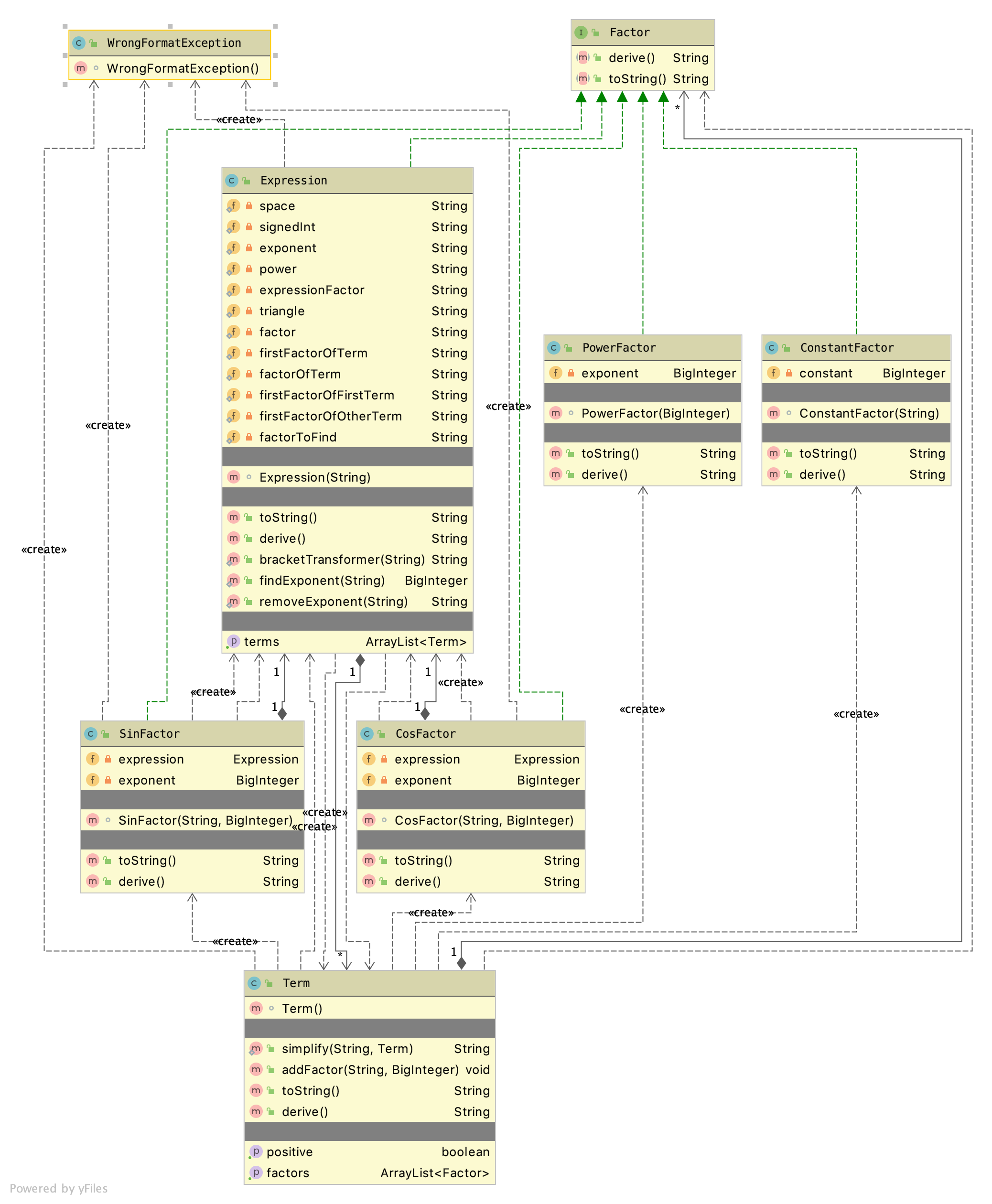 - 作业3的关键点在于如何处理三角函数中对于因子的嵌套。因为嵌套因子的存在,这次作业的设计几乎与前两次完全不同。接口Factor包含derive和toString方法。表示五种因子的五个因子类继承自Factor:Expression, SinFactor, CosFactor, PowerFactor, ConstantFactor. Expression中主要的属性是Arraylist
