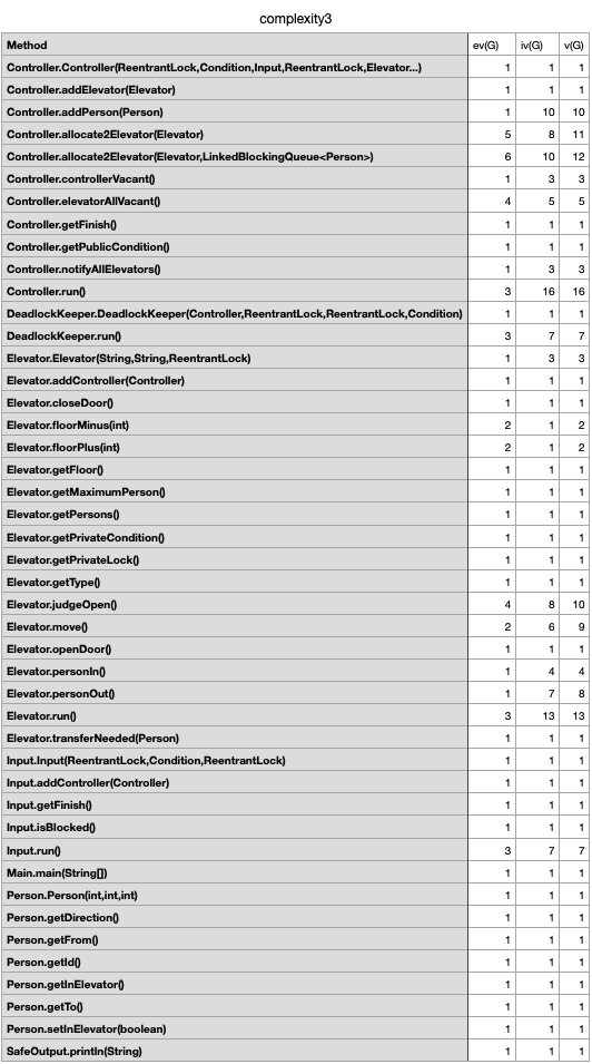 - 具体到方法上,可以说也是比较不错的,没有出现特别复杂的方法。相对比较复杂的方法除了run之外,还有Controller的addPerson(需要判断加入A, B, C三个队列的哪一个),allocate2Elevator(需要根据电梯种类以及是否为空进行分配),Elevator的judgeOpen(判断是否需要开门),move(判断当前需要运行的方向并运行)。