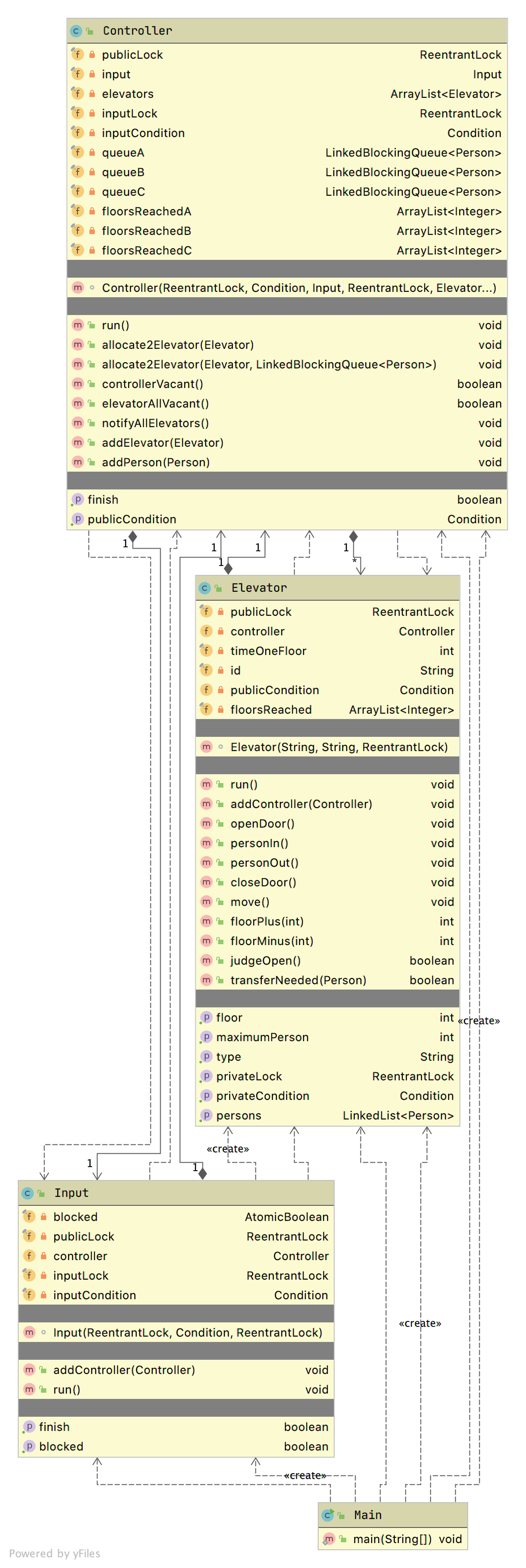 线程设计方面,都是一个Input(输入器)线程,一个Controller(控制器)线程,若干个Elevator(电梯)线程。交互方式上,主要通过锁来进行同步控制。每部电梯有一个自己的privateLock,这些privateLock对控制器也可见;同时控制器和所有电梯共享一个publicLock,控制器和输入器共享一个inputLock。(第一次作业中,由于只有一部电梯,电梯与控制器之间只共享一把锁。)