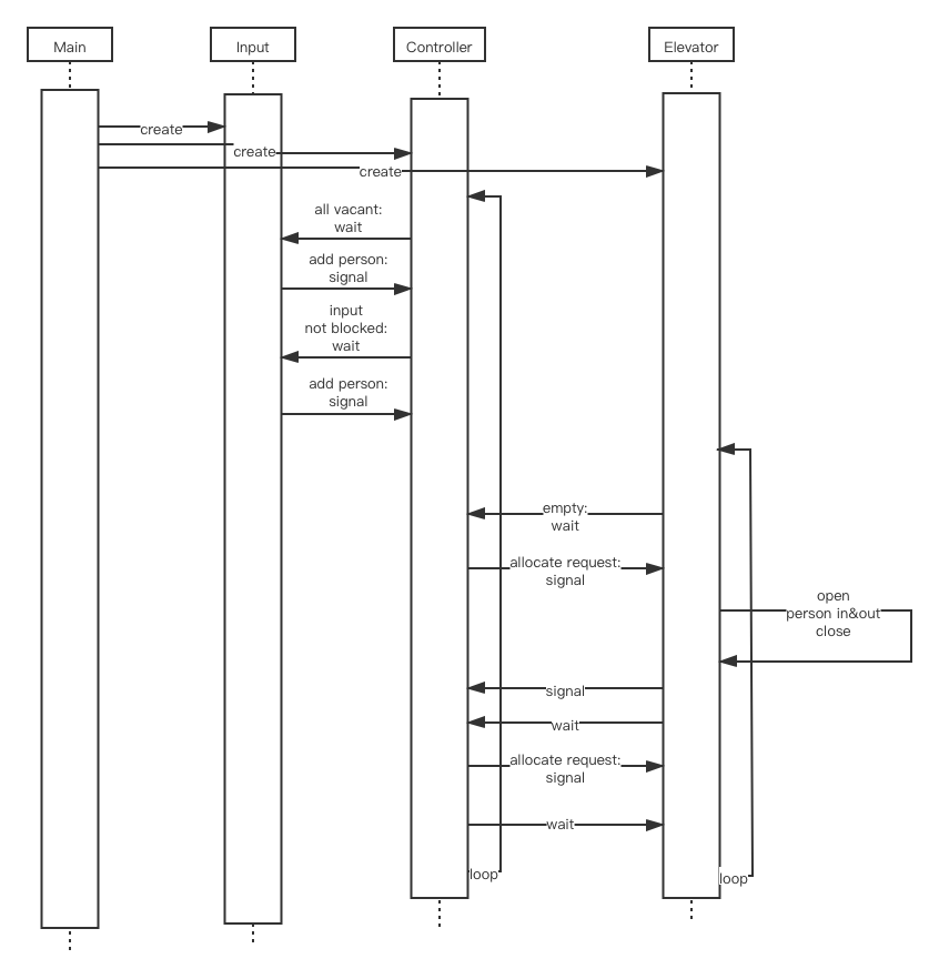 - 控制器每次被叫醒时,首先通过inputLock叫醒输入器,然后等待inputLock。接下来尝试获取每部电梯的privateLock,如果获得则说明该电梯为等待状态。对于等待状态的电梯,如果该电梯为空,给该电梯分配一个最近的请求;然后分配可捎带的请求。特殊情况是控制器和电梯的list全部为空时,等待inputLock.