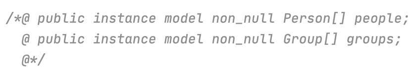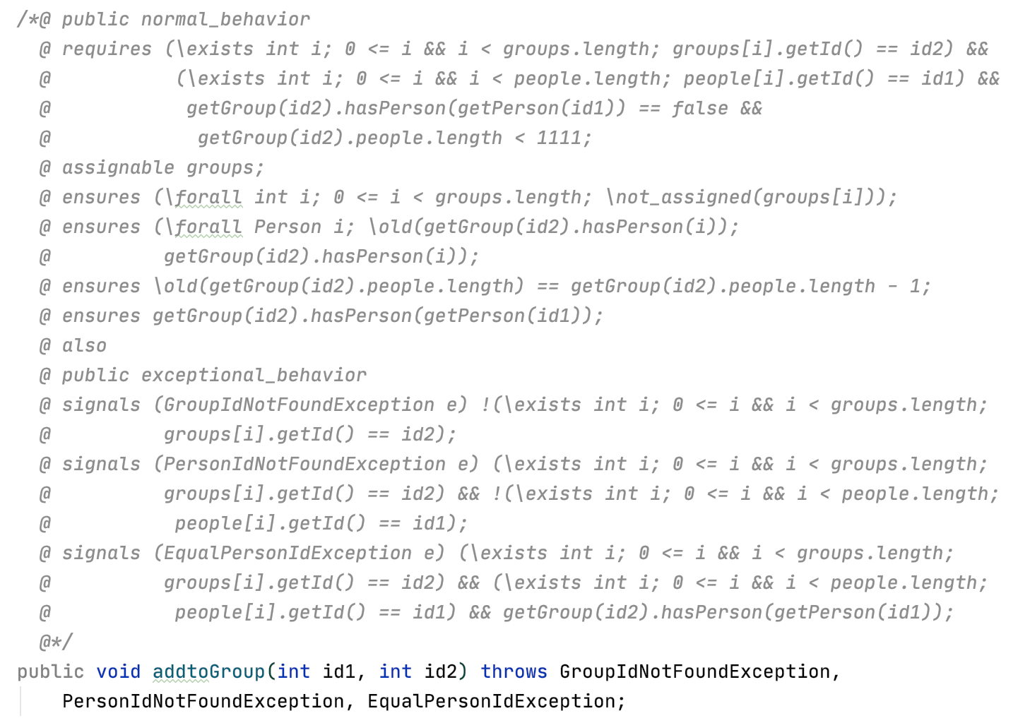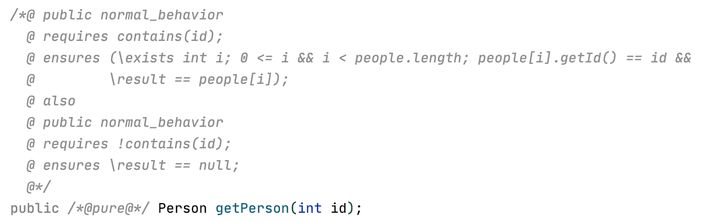 这个例子中的方法是把一个编号为id1的person加入到编号为id2的group中。从这个例子可以看出,一个方法的JML由0或更多个normal_behavior和0或更多个exceptional_behavior组成,之间用also连接。每个normal_behavior由requires(满足什么条件才执行这个behavior), assignable(这个behavior可能会修改什么对象), ensures(这个behavior执行后能保证什么结果)构成;而每个exceptional_behavior由requires, assignable, signals(满足特定条件需要抛出特定异常)构成。