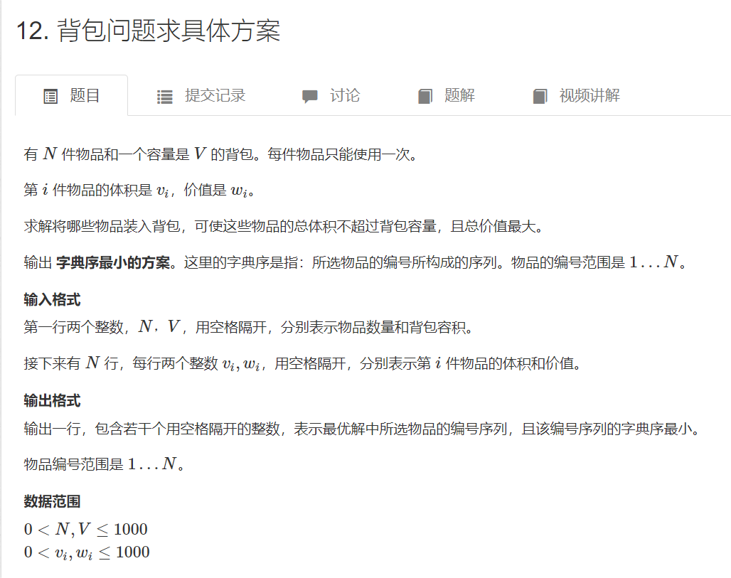 从1到n遍历,遇到当前容量(j)下价值(w)更大的方案就把path[j]清空,把path[j-v]转移过来,加上i