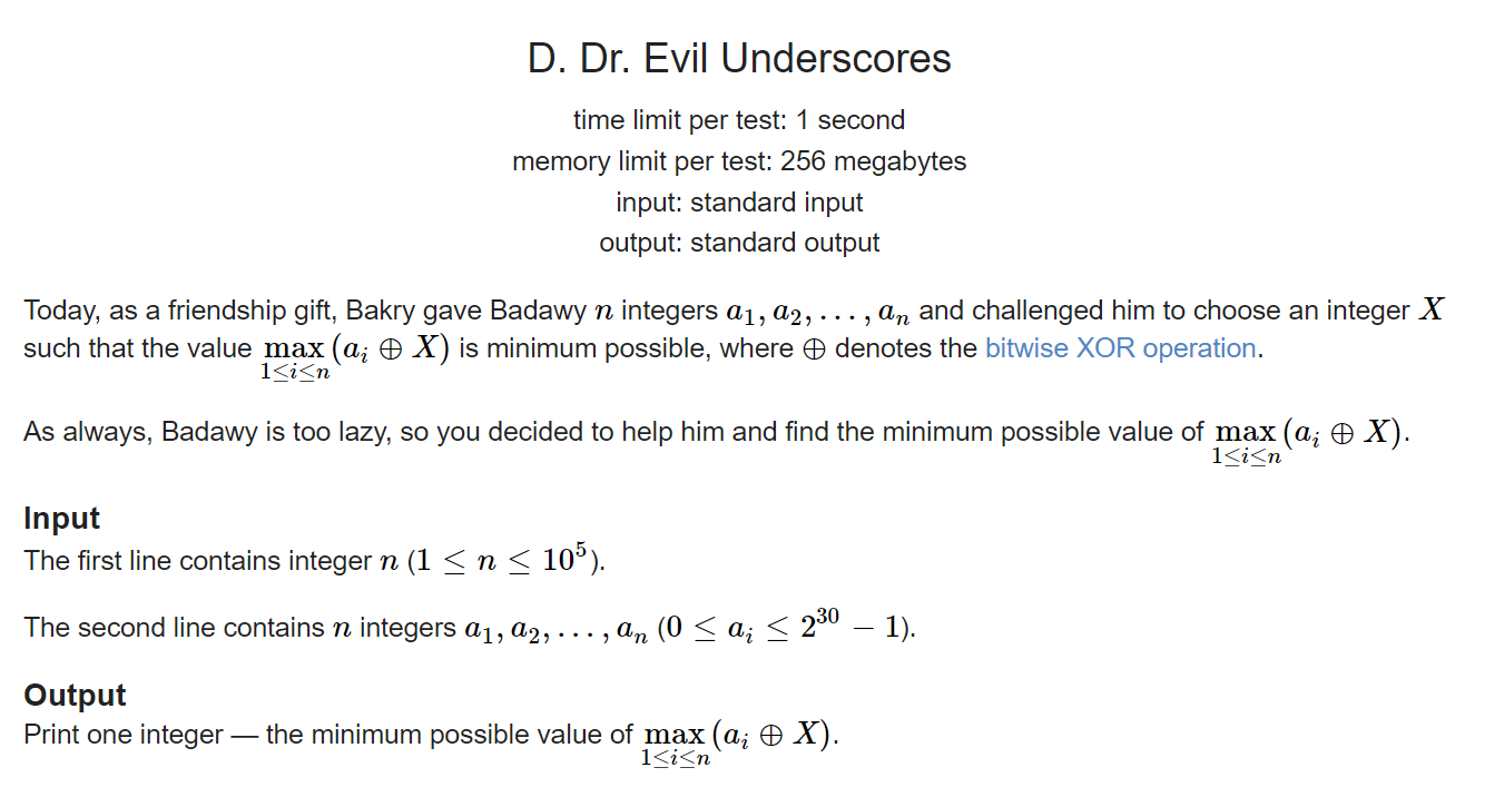 2、目前集合中当前位(第k位)同时存在0和1,那么此位对这个集合的贡献为 1 << k,然后以0和1划分当前集合的子集,分别求子集的最小贡献