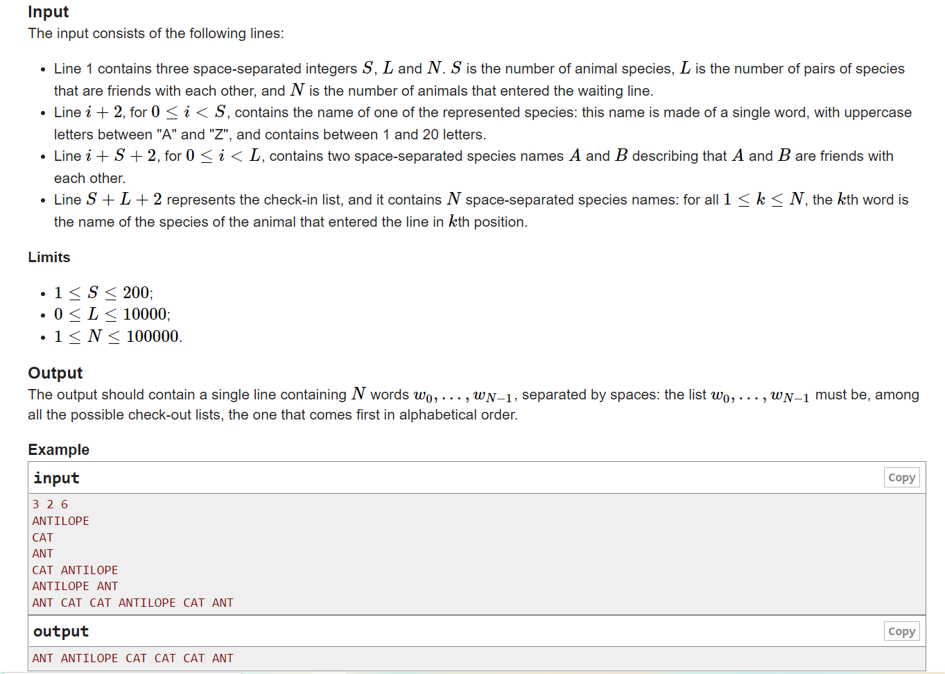 题意:给定S种动物,L个朋友关系,规定相邻的朋友可以交换位置,求排成一行的n个动物通过交换可以获得的最小字典序列