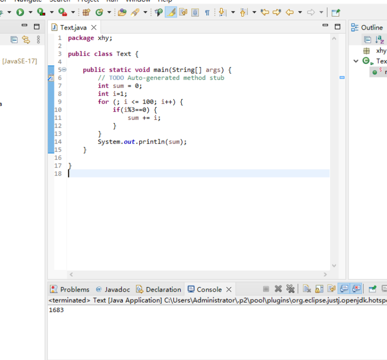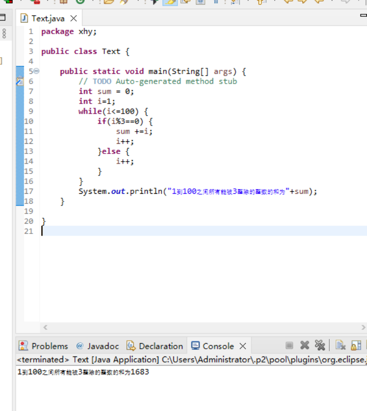 package xhy; public class Text { public static void main(String[] args) { // TODO Auto-generated method stub int sum = 0; int i=1; for (; i <= 100; i++) { if(i%3==0) { sum += i; } } System.out.println(sum); } }