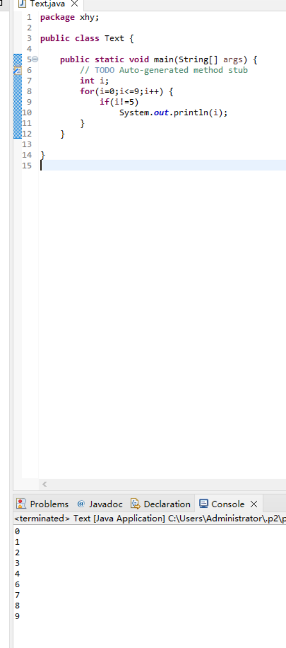 package xhy; public class Text { public static void main(String[] args) { // TODO Auto-generated method stub int i; for(i=0;i<=9;i++) { if(i!=5) System.out.println(i); } } }