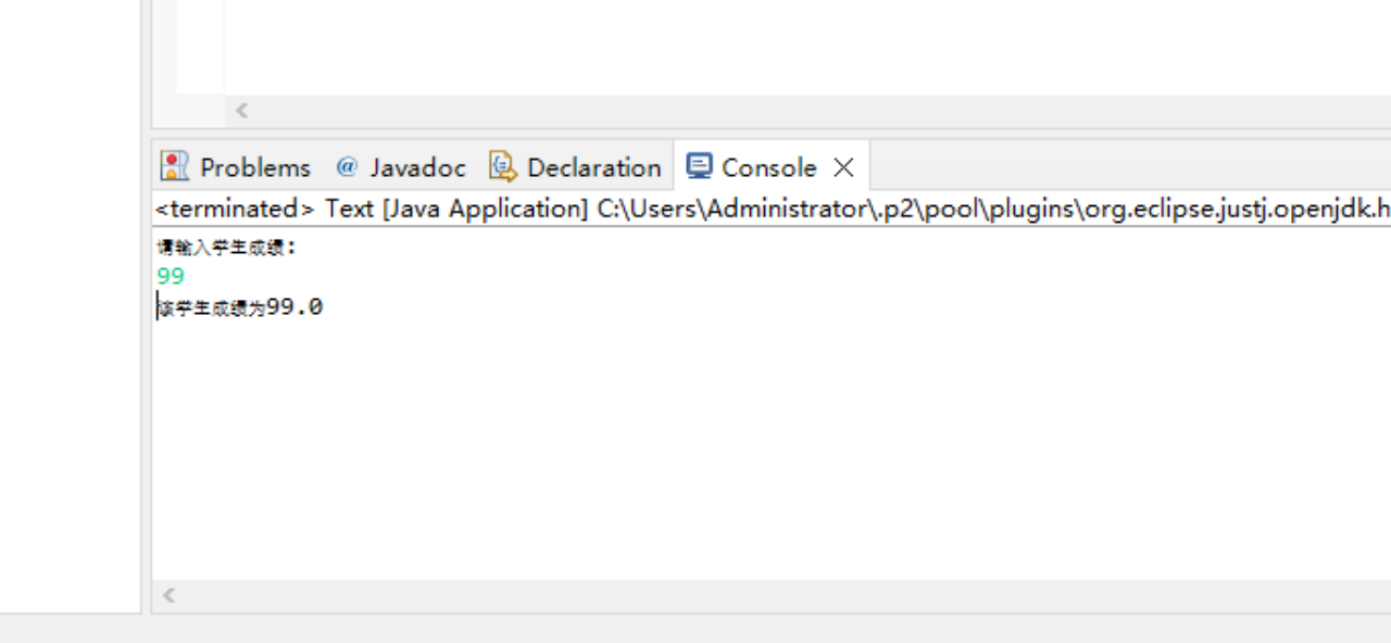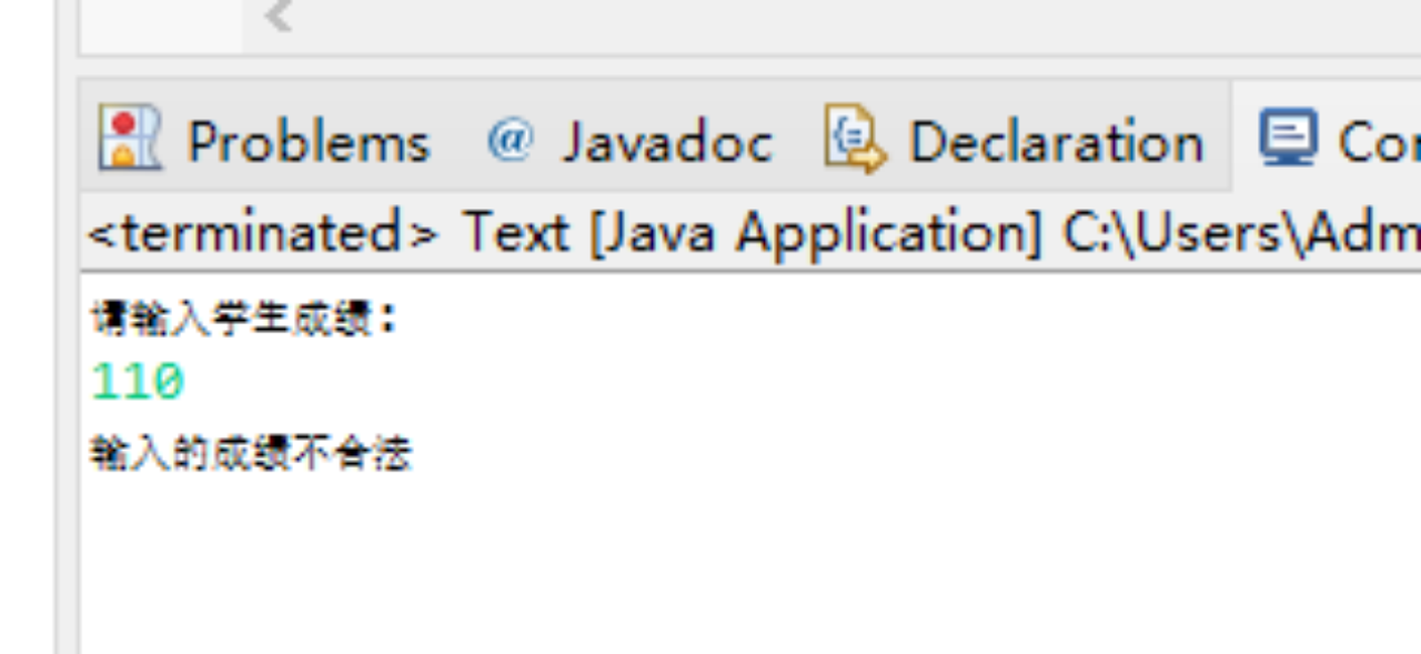 package xhy; import java.util.Scanner; public class Text { public static void main(String[] args) { // TODO Auto-generated method stub Scanner input = new Scanner(System.in); int i; for(i=0;;i++) { System.out.println("请输入学生成绩:"); double x=input.nextDouble(); if(x<0||x>100) { System.out.println("输入的成绩不合法"); }else { System.out.println("该学生成绩为"+x); } break; } } }