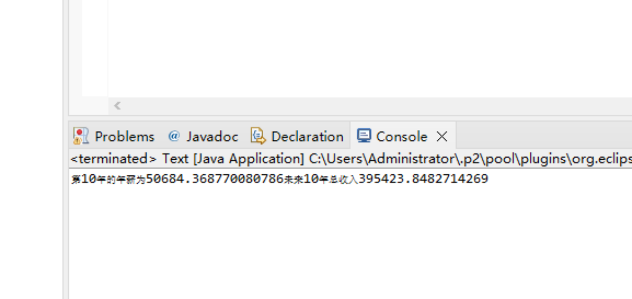 package xhy; import java.util.Scanner; public class Text { public static void main(String[] args) { // TODO Auto-generated method stub double x=30000; double sum=30000; for(int i=2;i<11;i++) { x=x*(1+0.06); sum=sum+x; } System.out.println("第10年的年薪为"+x+"未来10年总收入"+sum); } }