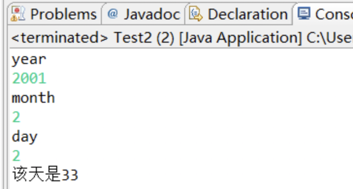 package Homework; import java.util.Scanner; public class Test2 { public static void main(String[] args) { // TODO Auto-generated method stub Scanner input=new Scanner(System.in); System.out.println("year"); int year=input.nextInt(); System.out.println("month"); int month=input.nextInt(); System.out.println("day"); int day=input.nextInt(); int mun=0; for(int i=1;i<month;i++){ switch (i){ case 4: case 6: case 9: case 11: mun=mun+30; break; case 1: case 3: case 5: case 7: case 8: case 10: case 12: mun=mun+31; break; case 2: if(year%4==0&year%100!=0|year%400==0) mun=mun+29; else mun=mun+28; break; } } mun=mun+day; System.out.println("该天是"+mun); } }