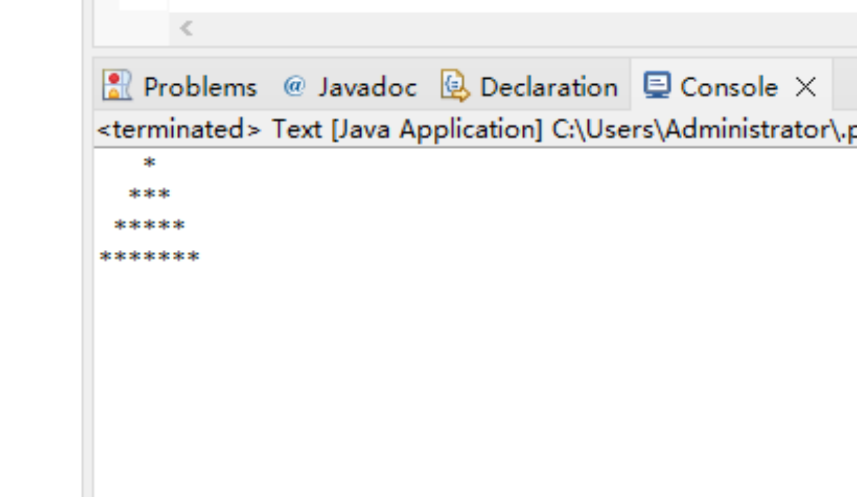package xhy; public class Text { public static void main(String[] args) { // TODO Auto-generated method stub for (int a=1;a<=4;a++) { for(int b=1;b<=4-a;b++) { System.out.print(" "); } for(int c=1;c<=2*a-1;c++) { System.out.print("*"); } System.out.println(); } } }