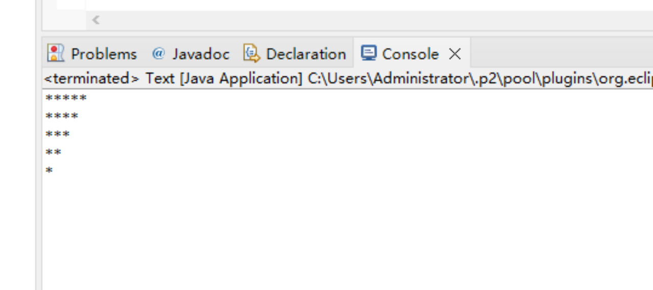 package xhy; public class Text { public static void main(String[] args) { // TODO Auto-generated method stub for (int a=1;a<=5;a++) { for(int b=5;b>=a;b--) { System.out.print("*"); } System.out.println(); } } }