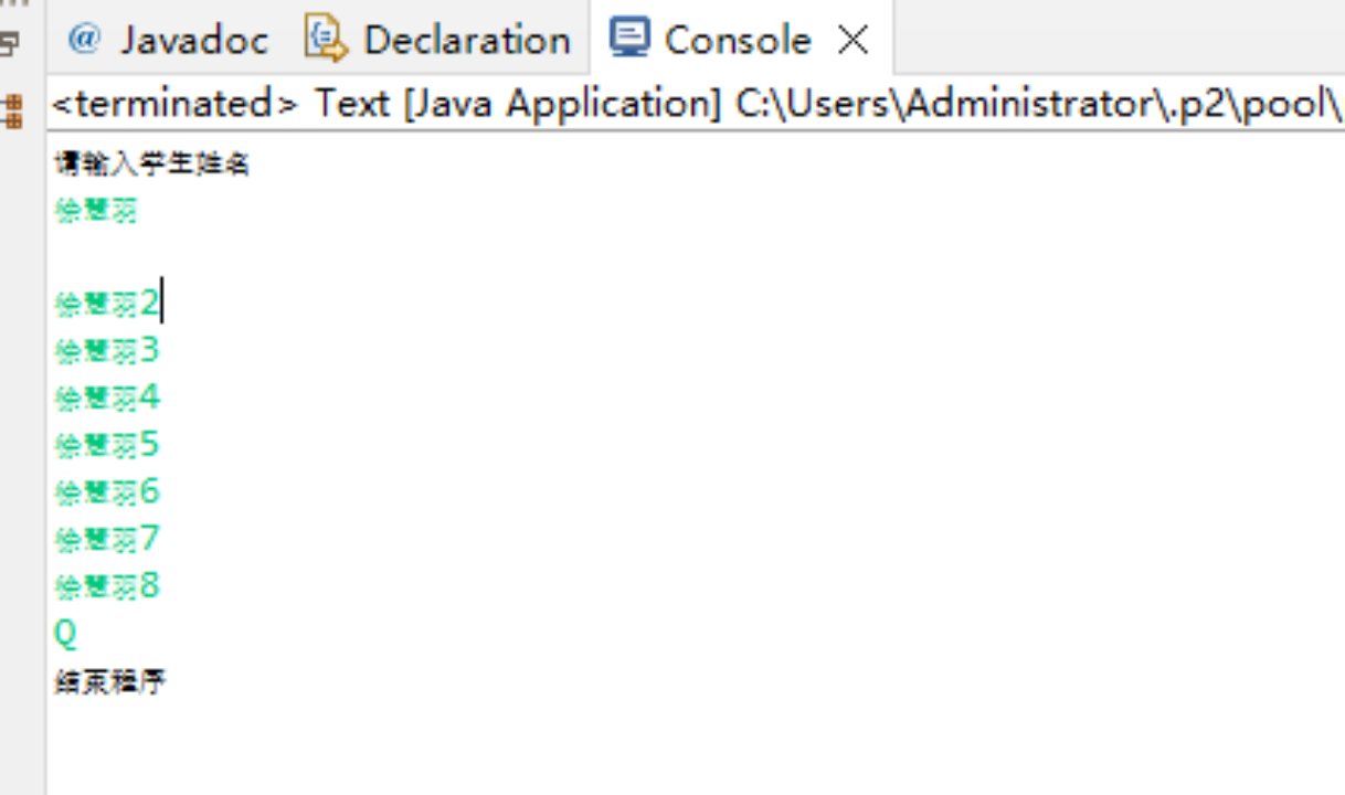 package xhy; import java.util.Scanner; public class Text { public static void main(String[] args) { // TODO Auto-generated method stub Scanner input=new Scanner(System.in); System.out.println("请输入学生姓名"); for(int a=1;;a++) { String name=input.next(); if (name.equals("Q")) { System.out.println("结束程序"); break; } } } }