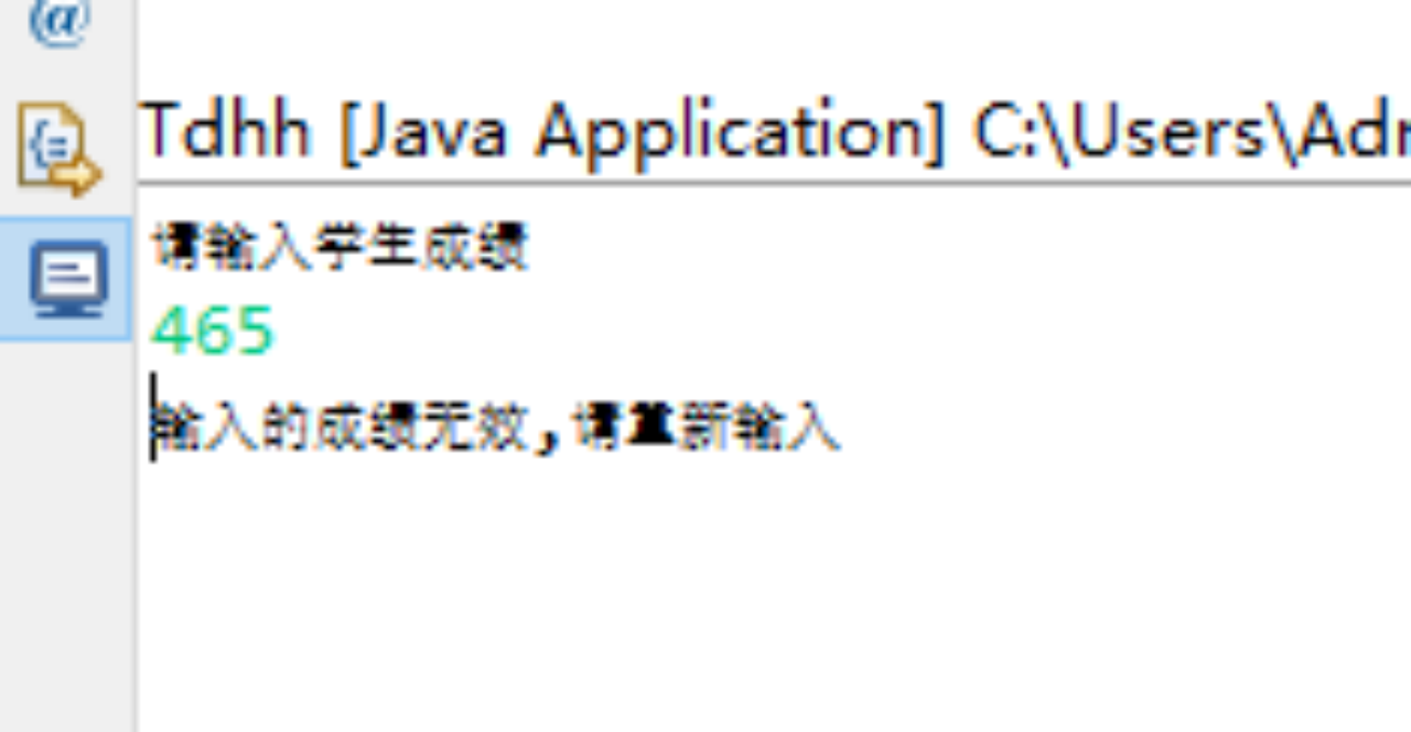 package xhy; import java.util.Scanner; public class Text { public static void main(String[] args) { // TODO Auto-generated method stub Scanner input=new Scanner(System.in); System.out.println("请输入学生成绩"); int sum=0; for(int i=1;i<=5;i++) { int grade =input.nextInt(); while (grade<0||grade>100) { System.out.println("输入的成绩无效,请重新输入"); grade=input.nextInt(); break; } sum+=grade; } } }