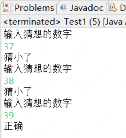 package homework6; import java.util.Random; import java.util.Scanner; public class Test1 { /** * @param args */ public static void main(String[] args) { // TODO Auto-generated method stub Random r=new Random(); Scanner input=new Scanner(System.in); int z=r.nextInt(98)+1; for(;;){ System.out.println("输入猜想的数字"); int a=input.nextInt(); if(a<z){ System.out.println("猜小了"); continue; }else if(a>z){ System.out.println("猜大了"); continue; }else System.out.println("正确"); break; } } }
