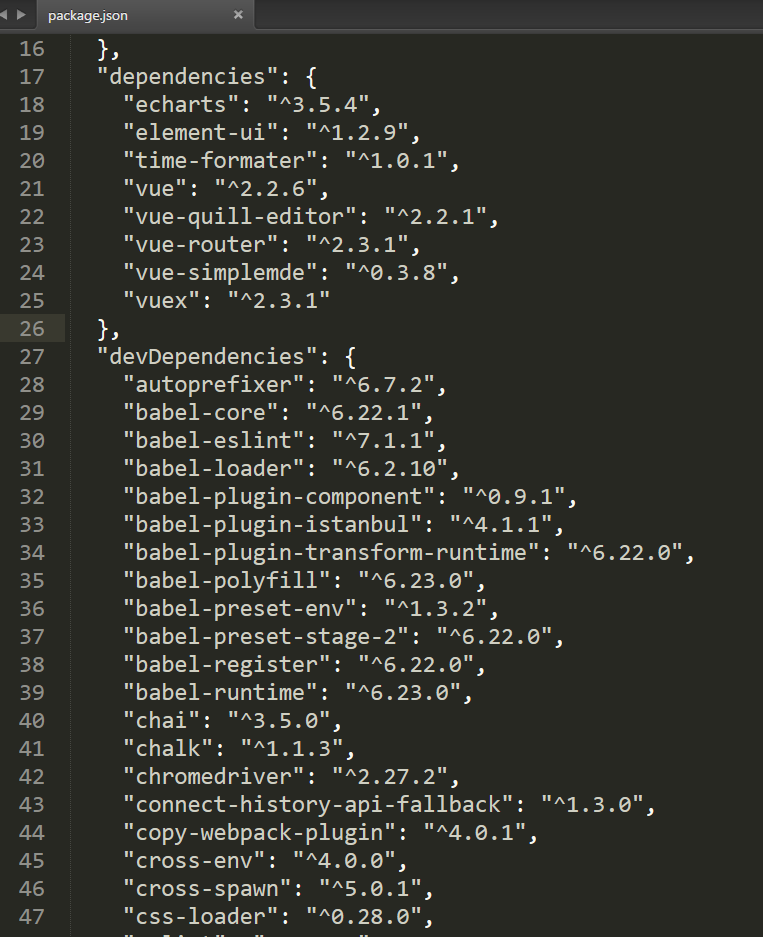 devDependencies 节点下的模块是我们在开发时需要用的,比如项目中使用的 gulp ,压缩css、js的模块。这些模块在我们的项目部署后是不需要的,所以我们可以使用 -save-dev 的形式安装。像 express 这些模块是项目运行必备的,应该安装在 dependencies 节点下,所以我们应该使用 -save 的形式安装。