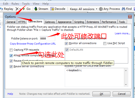 2、设置fiddler工具,允许其他电脑设备连接工具,在tools-->options-->connection设置。