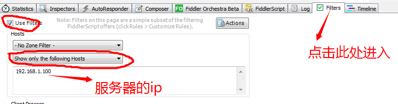 配置完成后,fiddler会抓取很多杂七杂八的数据,不方便查看,所以要先设置过滤只接收接口服务器IP的数据,标记处设置好即可