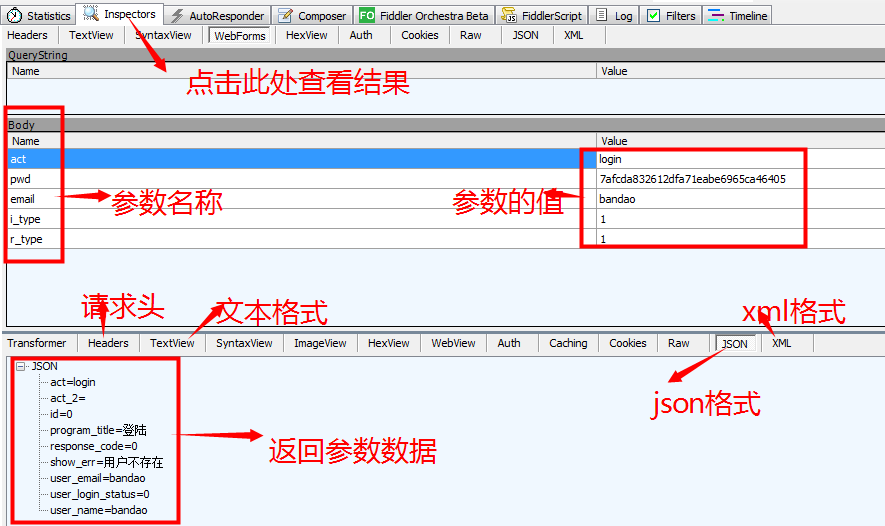我们再对参数进行分析即可,上部分为请求参数显示区,下部分为返回数据显示区,均有参数格式的选择。