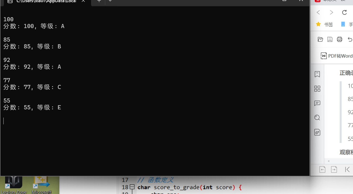#include <stdio.h> char score_to_grade(int score); // 函数声明 int main() { int score; char grade; while(scanf("%d", &score) != EOF) { grade = score_to_grade(score); // 函数调用 printf("分数: %d, 等级: %c\n\n", score, grade); } return 0; } // 函数定义 char score_to_grade(int score) { char ans; switch(score/10) { case 10: case 9: ans = 'A'; break; case 8: ans = 'B'; break; case 7: ans = 'C'; break; case 6: ans = 'D'; break; default: ans = 'E'; } return ans; }