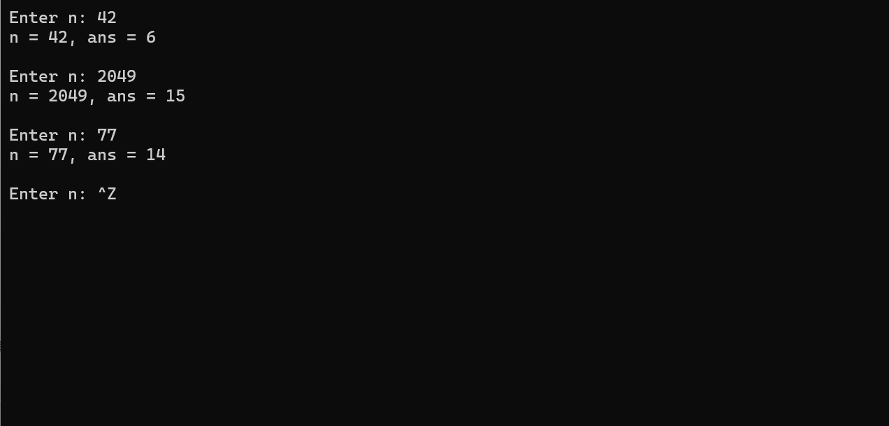 #include <stdio.h> int sum_digits(int n); // 函数声明 int main() { int n; int ans; while(printf("Enter n: "), scanf("%d", &n) != EOF) { ans = sum_digits(n); // 函数调用 printf("n = %d, ans = %d\n\n", n, ans); } return 0; } // 函数定义 int sum_digits(int n) { int ans = 0; while(n != 0) { ans += n % 10; n /= 10; } return ans; }