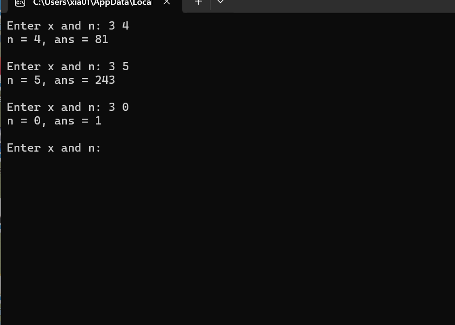 #include <stdio.h> int power(int x, int n); // 函数声明 int main() { int x, n; int ans; while(printf("Enter x and n: "), scanf("%d%d", &x, &n) != EOF) { ans = power(x, n); // 函数调用 printf("n = %d, ans = %d\n\n", n, ans); } return 0; } // 函数定义 int power(int x, int n) { int t; if(n == 0) return 1; else if(n % 2) return x * power(x, n-1); else { t = power(x, n/2); return t*t; } }
