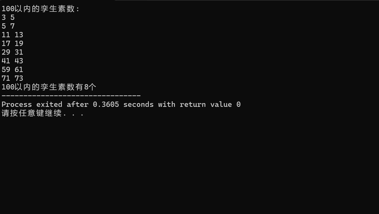 #include<stdio.h> int is_prime(int n); int x=0; int main() { printf("100以内的孪生素数:\n"); for(int n=0;n<100;n++){ if(is_prime(n)&&is_prime(n+2)){ printf("%d %d\n",n,n+2); x+=1; } } printf("100以内的孪生素数有%d个",x); return 0; } int is_prime(int n){ if(n<2) return 0; for(int i=2;i*i<=n;i++){ if(n%i==0) return 0; } return 1; }