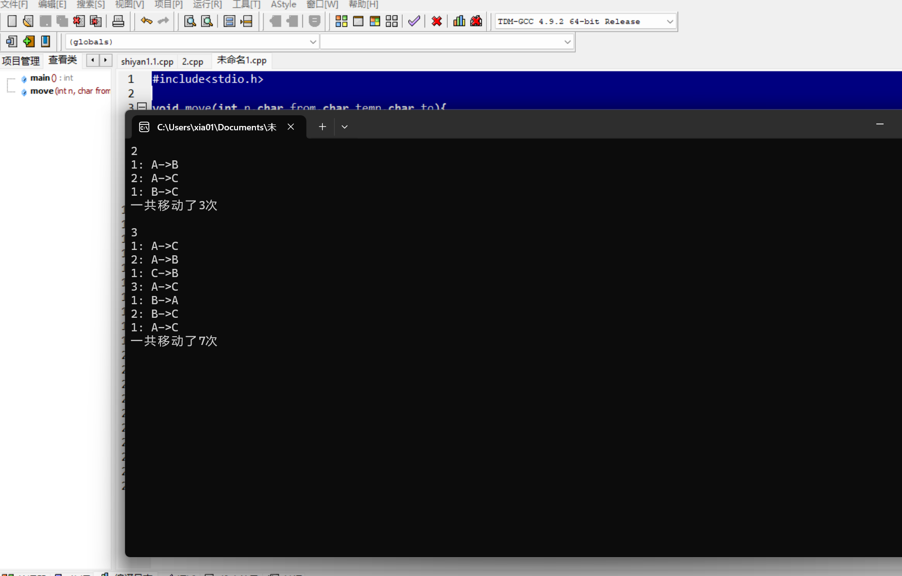 #include<stdio.h> void move(int n,char from,char temp,char to){ if(n==1){ printf("%d: %c->%c\n",n,from,to); return; } else{ move(n-1,from,to,temp); printf("%d: %c->%c\n",n,from,to); move(n-1,temp,from,to); } } int main(){ int n,x=0; while(scanf("%d",&n)!=EOF){ move(n,'A','B','C'); x=(1<<n)-1; printf("一共移动了%d次\n\n",x); } return 0; }