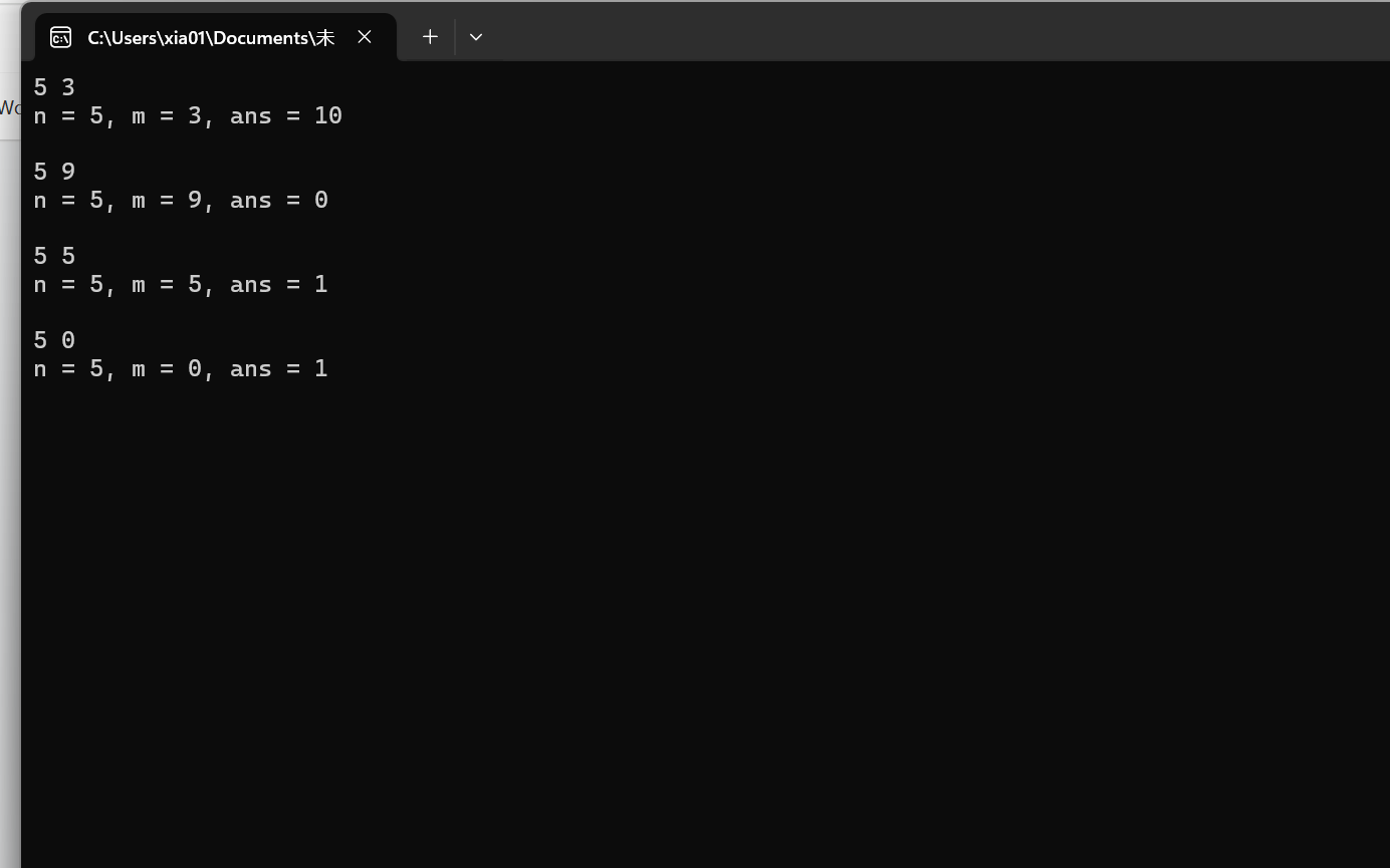 include <stdio.h> int func(int n, int m); // 函数声明 int jc(int x); int main() { int n, m; int ans; while(scanf("%d%d", &n, &m) != EOF) { ans = func(n, m); // 函数调用 printf("n = %d, m = %d, ans = %d\n\n", n, m, ans); } return 0; } int func(int n,int m){ int x=1,y=1,p=1,i; char ans; if(n<m) return ans=0; else if(m==0||n==m) return ans=1; else { for(int i=1;i<n;i++){ x*=(n+1-i); } for(int i=1;i<m;i++){ y*=(m+1-i); } for(int i=1;i<n-m;i++){ p*=(n-m+1-i); } ans=x/(y*p); return ans ;} }