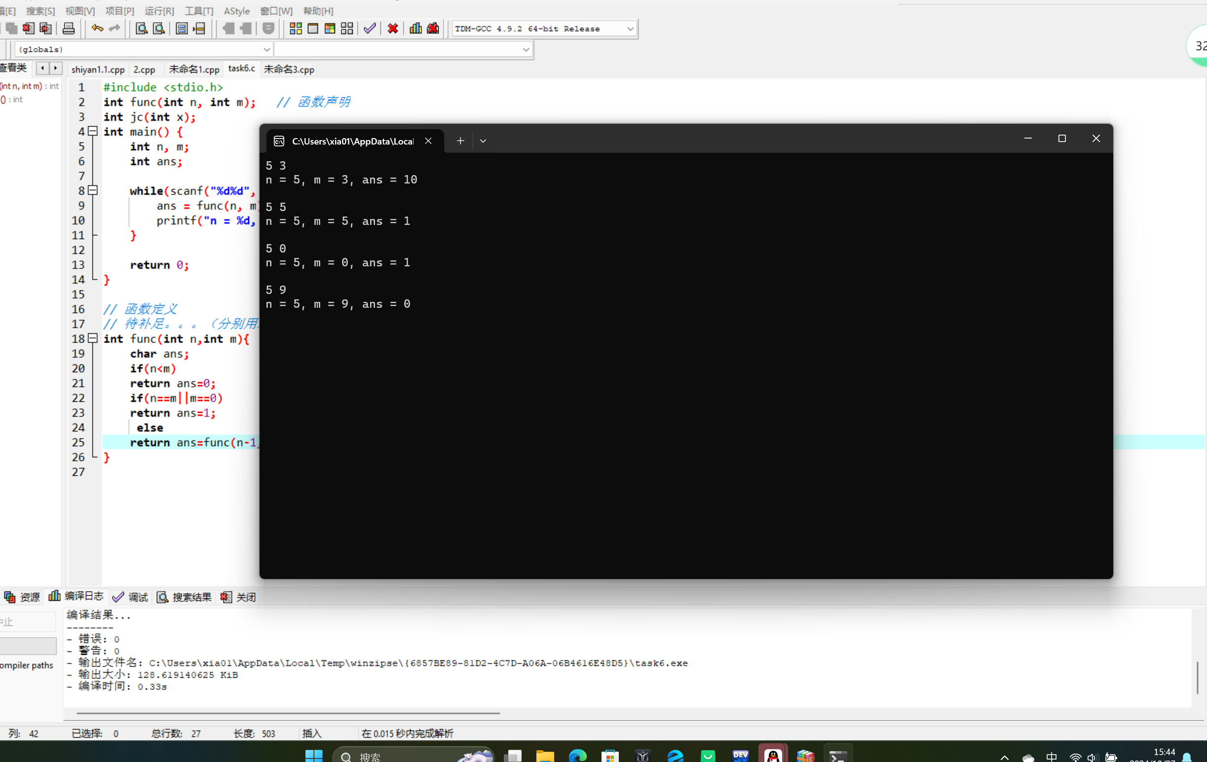 #include <stdio.h> int func(int n, int m); // 函数声明 int jc(int x); int main() { int n, m; int ans; while(scanf("%d%d", &n, &m) != EOF) { ans = func(n, m); // 函数调用 printf("n = %d, m = %d, ans = %d\n\n", n, m, ans); } return 0; } // 函数定义 // 待补足。。。(分别用迭代和递归实现) int func(int n,int m){ char ans; if(n<m) return ans=0; if(n==m||m==0) return ans=1; else return ans=func(n-1,m)+func(n-1,m-1); }