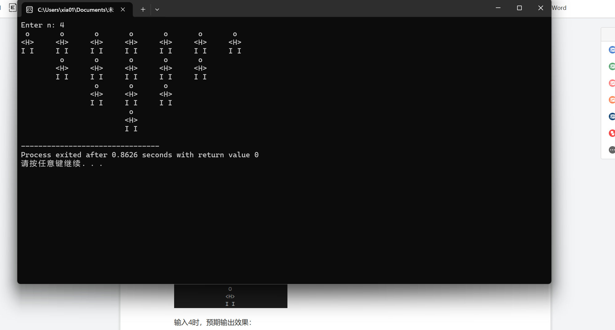 #include <stdio.h> #include <stdlib.h> void print_charman(int n); int main() { int n; printf("Enter n: "); scanf("%d", &n); print_charman(n); return 0; } void print_charman(int n){ for(int i=0;i<n;i++){ int x=2*(n-i)-1; printf("%*s",8*i,""); for(int j=0;j<x;j++) printf(" o \t"); printf("\n"); printf("%*s",8*i,""); for(int j=0;j<x;j++) printf("<H>\t"); printf("\n"); printf("%*s",8*i,""); for(int j=0;j<x;j++) printf("I I\t"); printf("\n"); } }