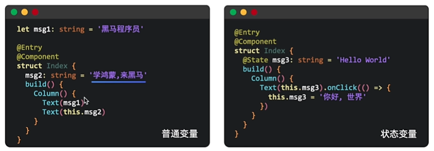 状态变量: 被装饰器(@State)装饰,** 变量值改变会引起UI的渲染刷新** (必须设置类型和初始值)