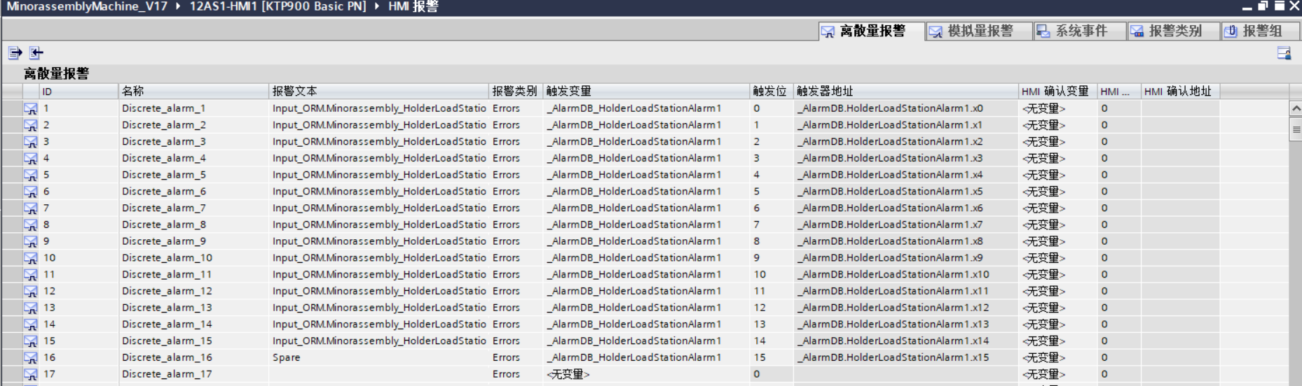 完事之后再去HMI的HMI报警里面,把你定义好的报警文本和报警变量对应上,Ctrl+C/Ctrl+V吧。
