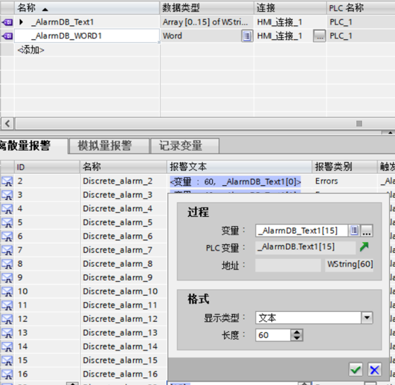 现在回到HMI侧,在HMI变量表新建你的AlarmDB_Word和AlarmDB_Text(就是在PLC程序里面建立的报警字和对应报警文本数组,数组格式我定义成Array[0..15] of WString[60]);